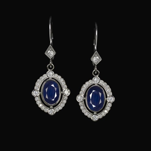 These sapphire and diamond dangle earrings feature a pair of bright green sapphires surrounded by an eye-catching Art Deco style halo design.