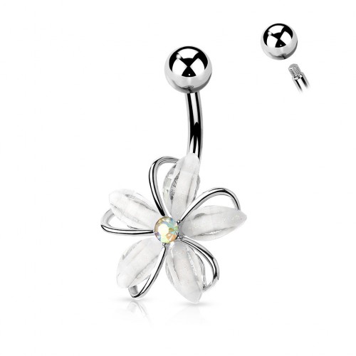 Sparkly internally threaded flower belly button ring with multi-colored vitrail medium gem center and clear gem petals. Both the bottom and top have the gorgeous flower for an all over sparkle and shine.