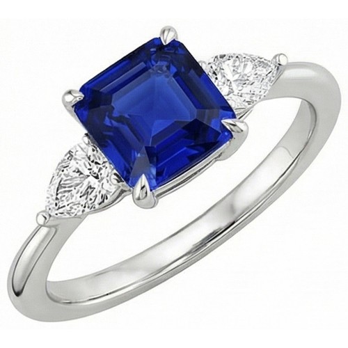 Stone Details : There is one cushion cut sapphire approx. 2.25 carats (Approx. Size 7 x 7 mm) and two pear diamonds approx. 0.25 carats each (Approx. Size 5.5 x 3.5 mm) on the sides. Natural earth mined stones.